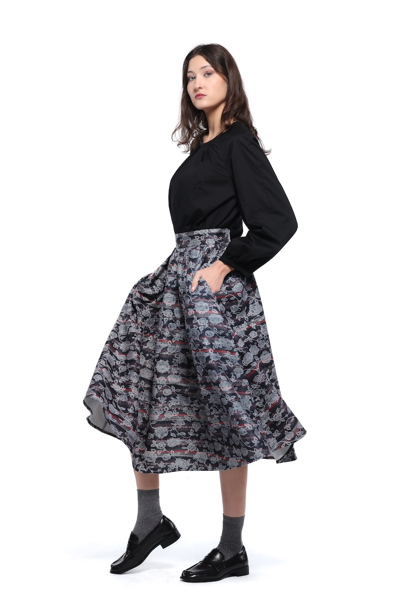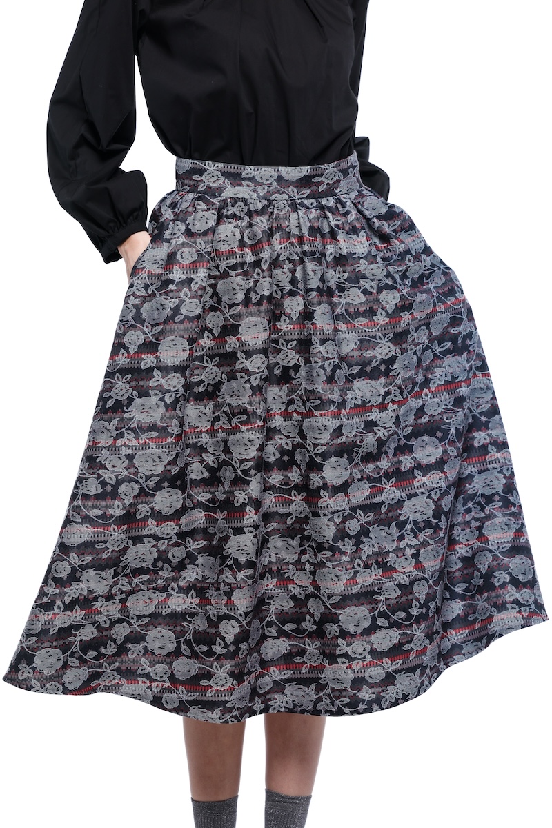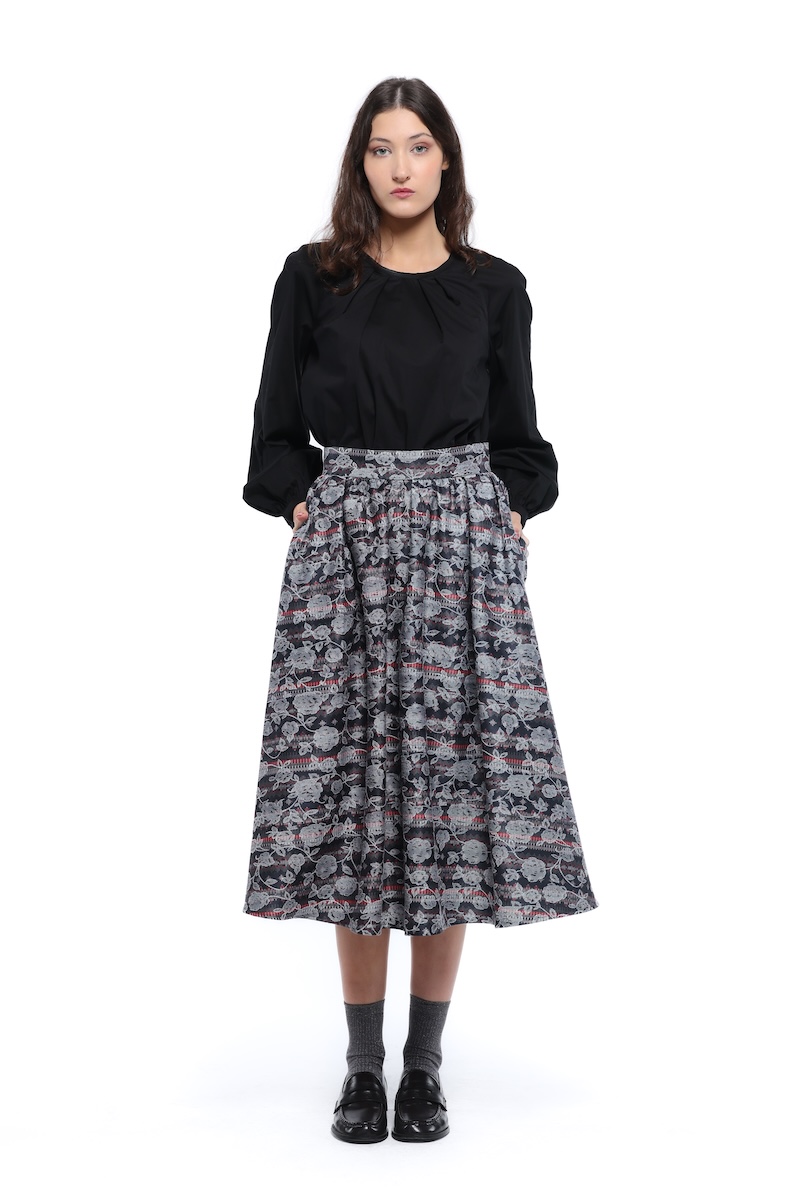 The BARBARA skirt is crafted from rich floral brocade in a midi length, offering an elegant and striking appearance. The design features a wide waistband and pockets, with volume achieved through a combination of pleats and gathers. It is fully lined and fastens with a concealed zipper
