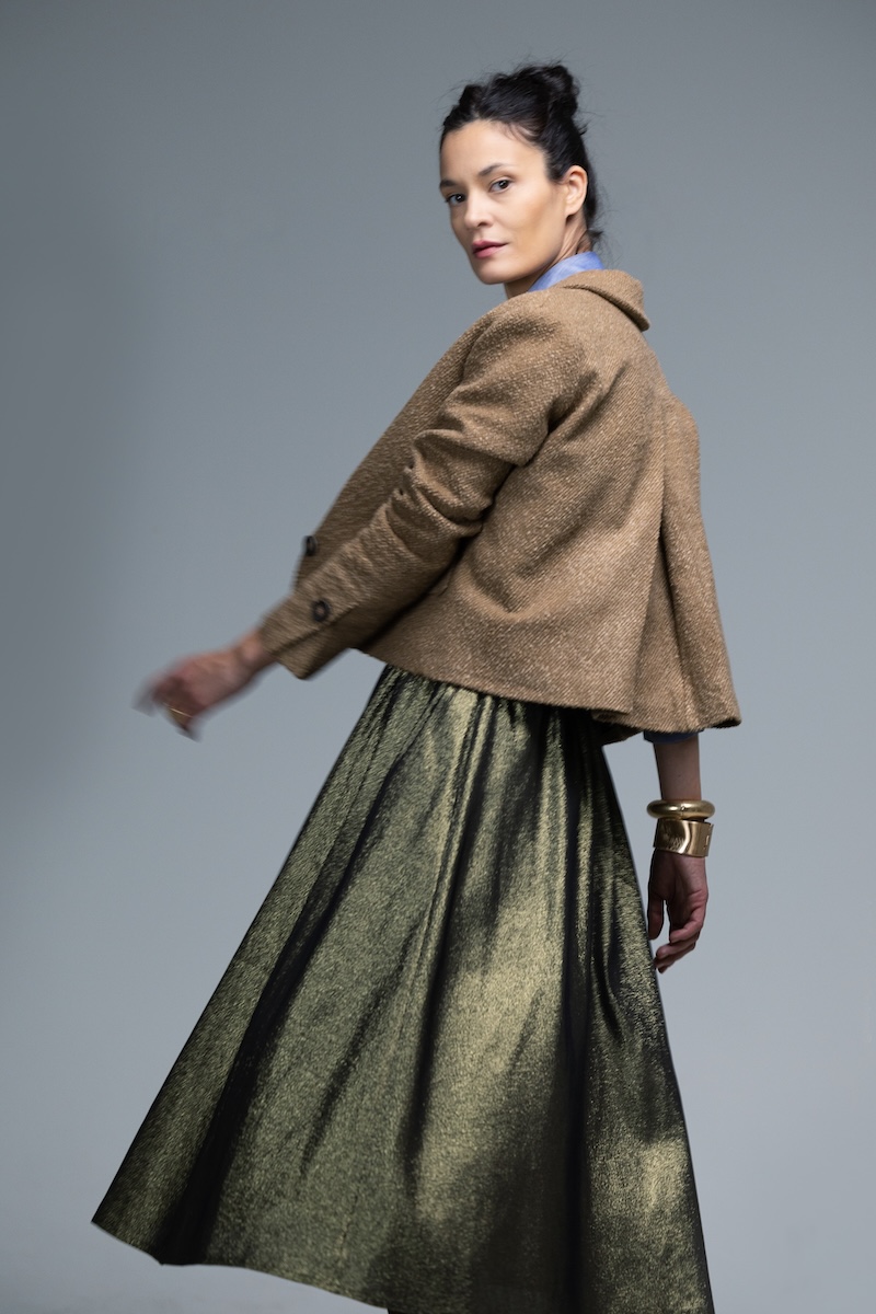 High-waisted skirt made of golden rhinestone fabric. Voluminous model designed in a slight A cut.