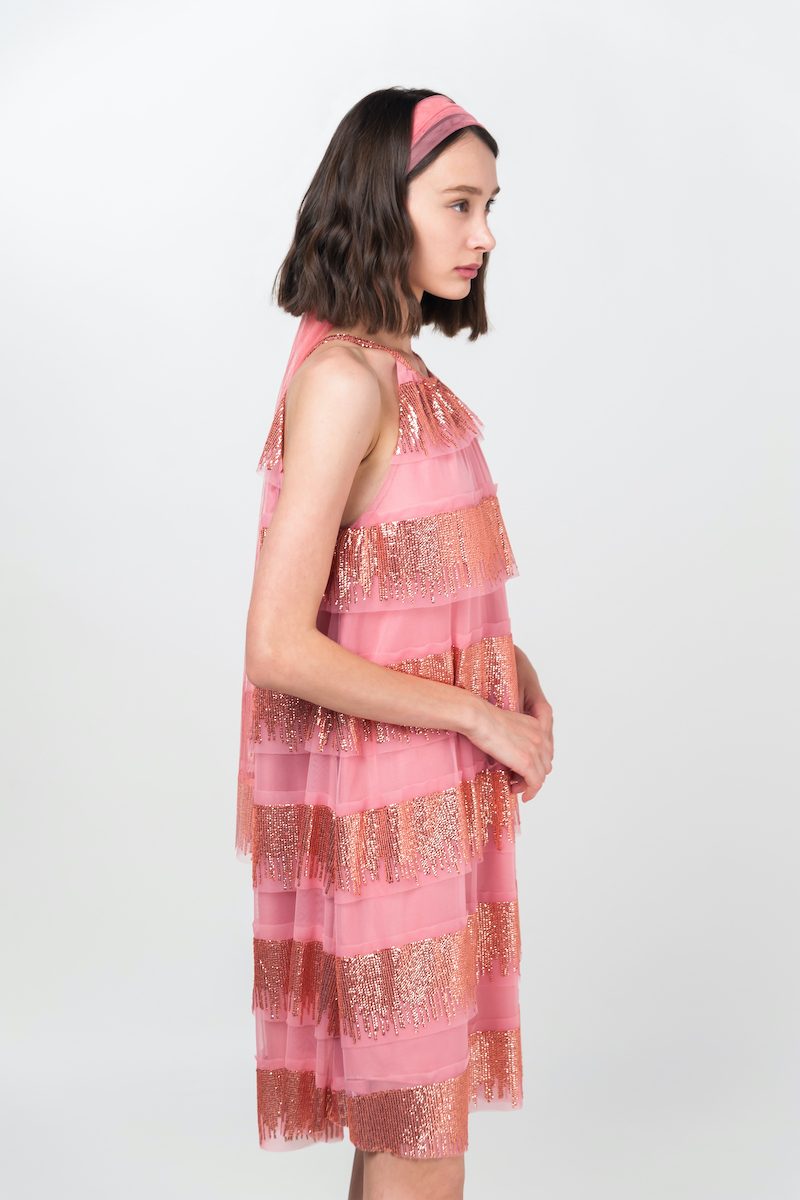 Short tulle dress in exotic pink color. With strass beads in a copper shade and a scarf as an accessory, the DUNJA dress revives the Belle Epoque period with its appearance and invites you to have a fantastic time at a cocktail party.