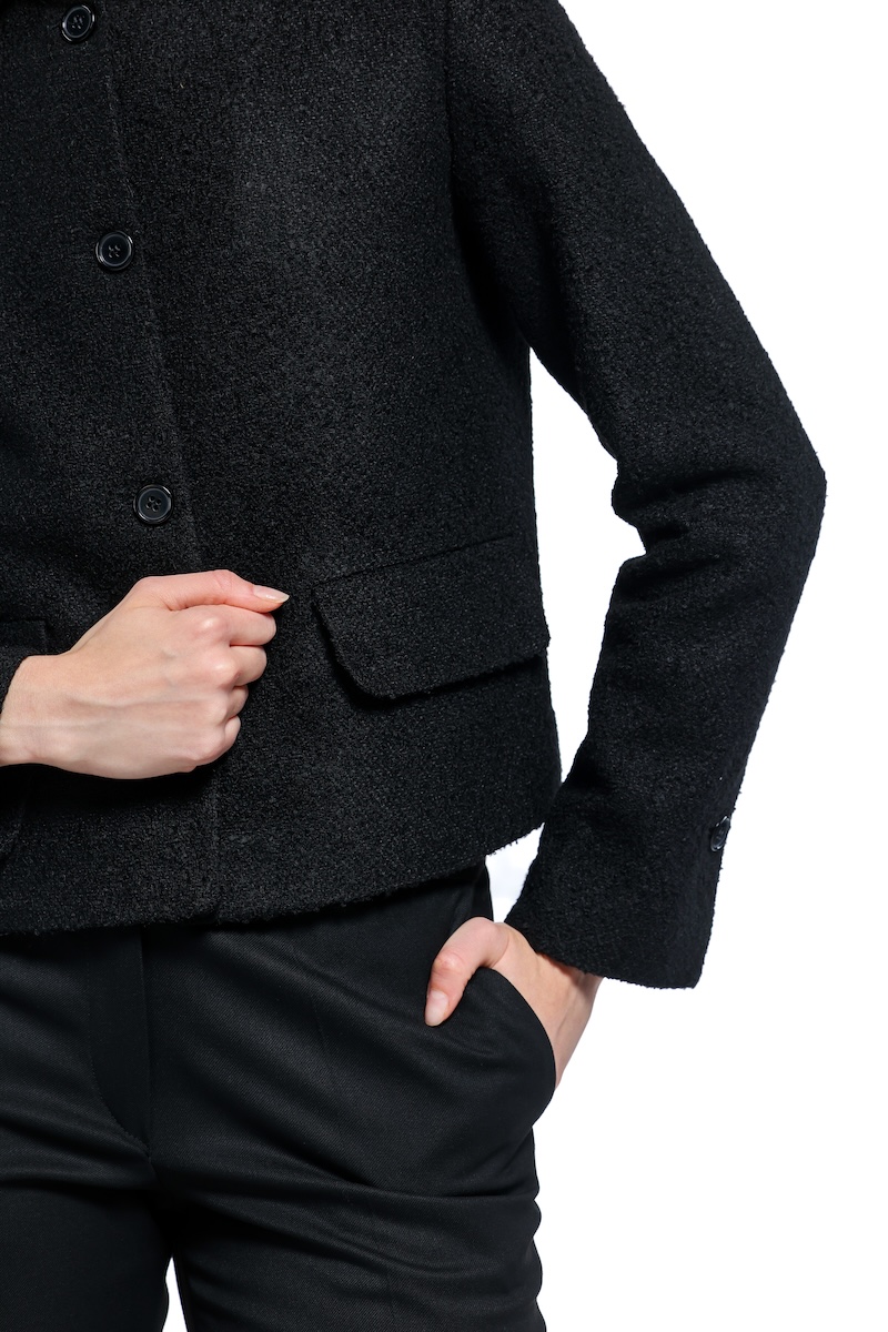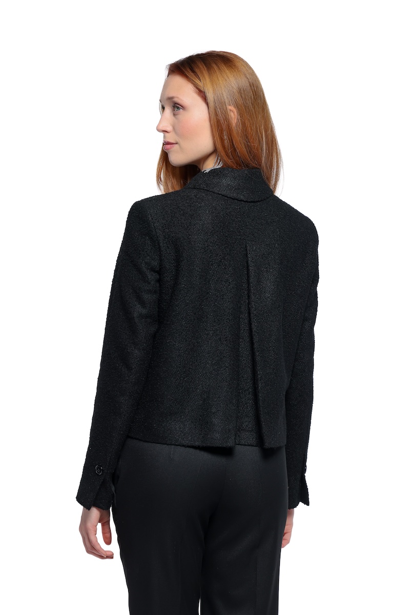 The girl wears a black waisted, cropped blazer.