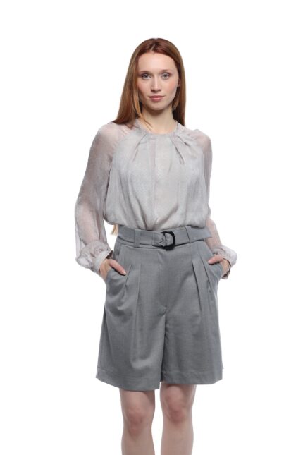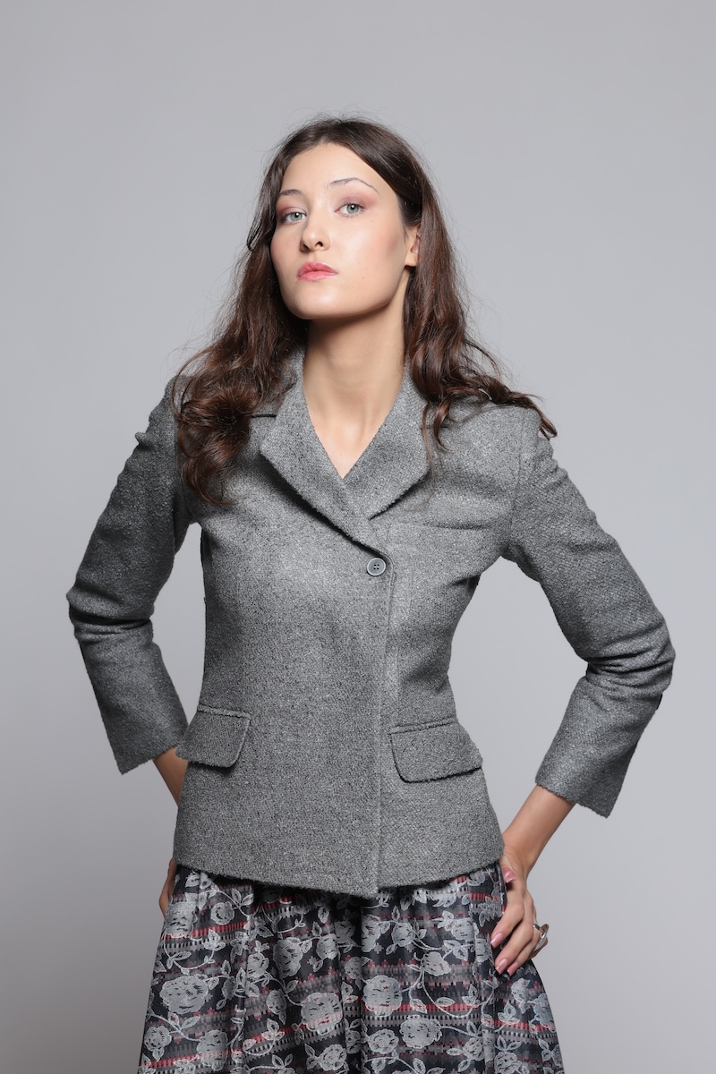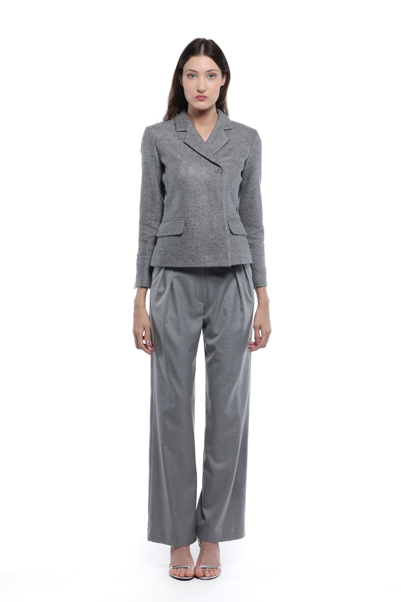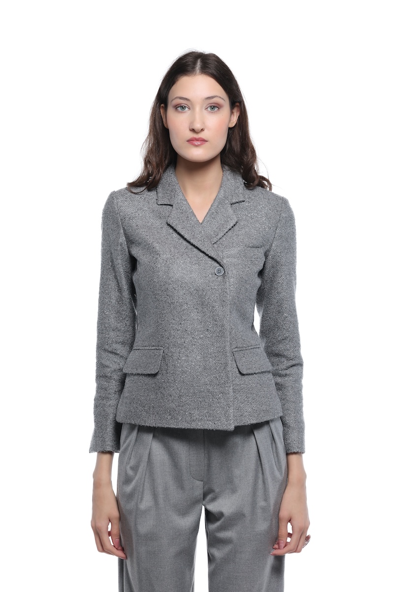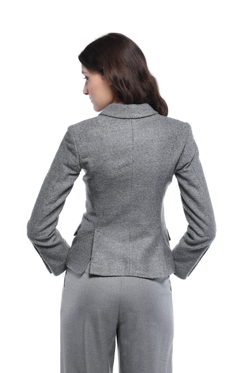 Strukturirani blejzer čistih linija, oblikovan tako da naglasi siluetu. Ima rukave završene dekorativnim dugmetom, dva diskretna razreza pozadi i klasične reverе koje vizuelno izdužuju gornji deo. Prednje kopčanje je kombinovano, sa dva skrivena dugmeta, a džepovi sa patnama i paspul džep u predelu grudi dodaju uredan, definisan izgled. Savršen komad za moderno, slojevito stilizovanje.