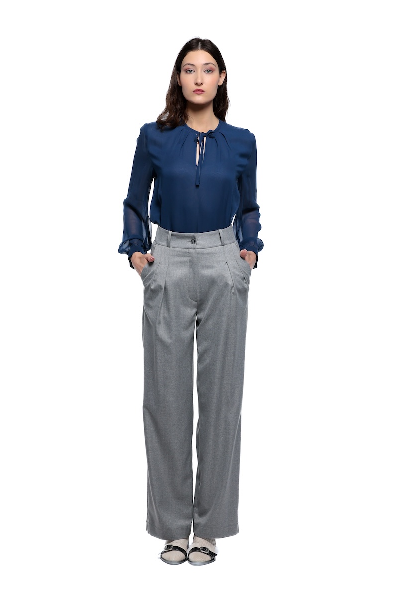 Model nosi sivi GIGI blejzer sa klasičnim reverima, jednim dugmetom i džepovima sa patnama. Blejzer je uparen sa sivim širokim pantalonama na beloj pozadini.
